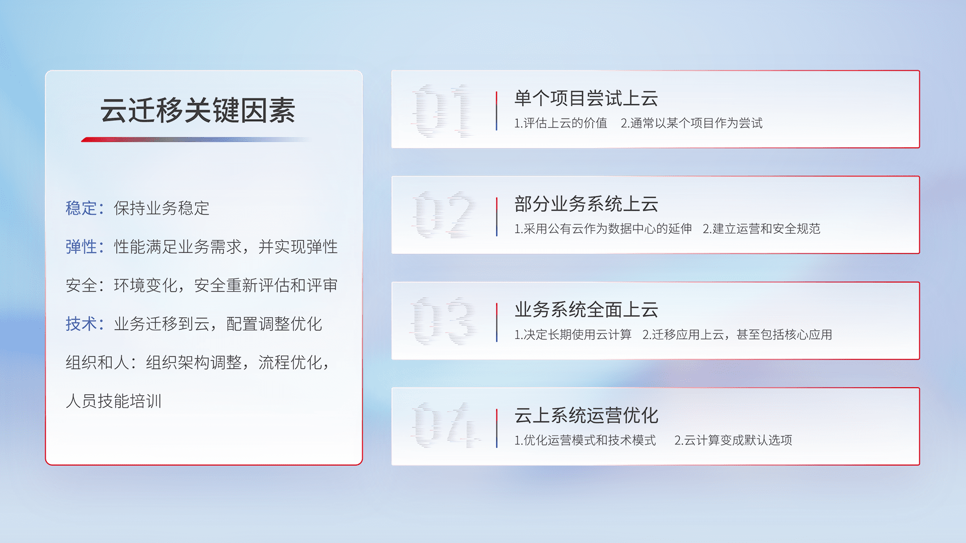 结合实际业务,,,从规划设计、、云平台选型、、云原生改造、、、数据迁移、、、、集成交付,,,,迁移全过程为客户识别最佳上云路径,,,,做好风险识别管理,,,设计网络架构、、、身份权限、、安全审计合规、、操作审计、、、日志审计、、、、监控告警策略、、、、多站点容灾设计等,,对云上基础设施进行整体规划,,,,提升IT治理水平,,以满足弹性、、、高可用、、、、高性能的需求。。